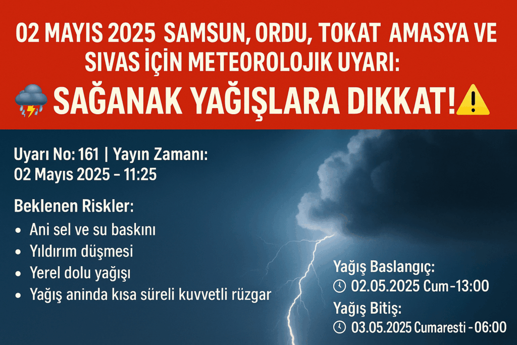 Orta Karadeniz için kritik uyarı geldi! Meteoroloji Genel Müdürlüğü, 2 Mayıs 2025 Cuma günü öğle saatlerinden itibaren Samsun, Ordu, Tokat, Amasya’nın doğusu ve Sivas’ın kuzeyinde etkili olması beklenen kuvvetli gök gürültülü sağanak yağışlara karşı vatandaşları uyardı.