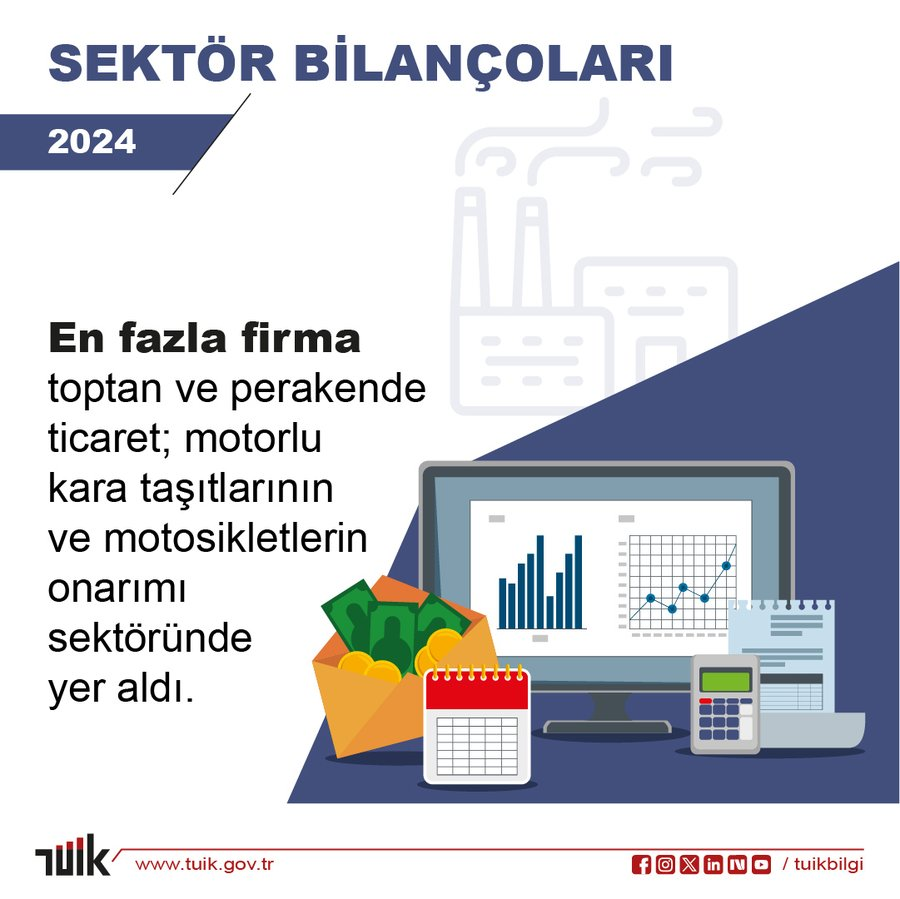 Türkiye İstatistik Kurumu (TÜİK) tarafından açıklanan Sektör Bilançoları, 2024 sonuçlarına göre firma sayısının sektörel dağılımında ilk sırayı 356 bin 62 firma ile toptan ve perakende ticaret aldı. İmalat sektörü ise toplam firma sayısı içinde %16,4’lük pay ile öne çıktı.