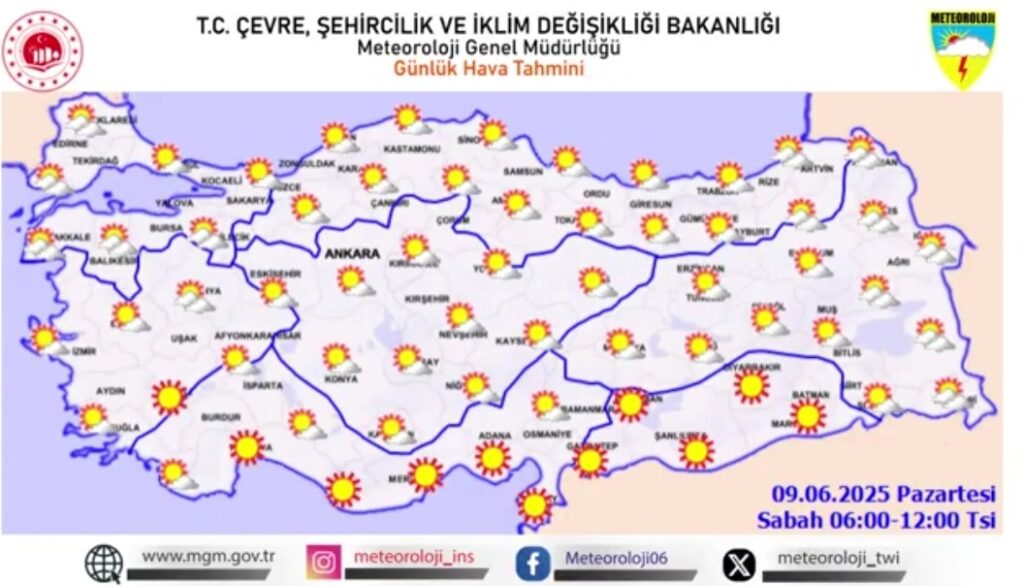 Meteoroloji Genel Müdürlüğü (MGM), 9 Haziran 2025 Pazartesi günü için yurt genelinde detaylı hava durumu tahminlerini paylaştı. Hava sıcaklıklarının mevsim normallerinin üzerinde seyretmeye devam etmesi bekleniyor. İşte bölgelere göre saatlik hava durumu raporu: