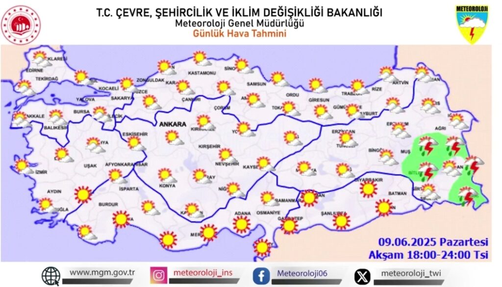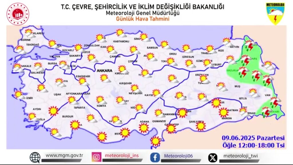 9 Haziran 2025 Pazartesi günü, Türkiye genelinde hava sıcaklıkları mevsim normallerinin üzerinde seyretmeye devam ederken, yurdun büyük bölümünde güneşli ve açık bir hava bekleniyor. Ege, Akdeniz, İç Anadolu ve Güneydoğu Anadolu’da güneş etkisini sürdürürken, Doğu Anadolu Bölgesi’nde öğle ve akşam saatlerinde Artvin, Erzurum, Kars, Ağrı, Van ve Hakkari çevrelerinde yerel sağanak ve gök gürültülü sağanak yağışlar görülecek. Yağışların bazı bölgelerde kuvvetli olması bekleniyor. Marmara’nın batısı ile Karadeniz’in iç kesimlerinde ise yer yer bulutlu bir gökyüzü hâkim olacak.
