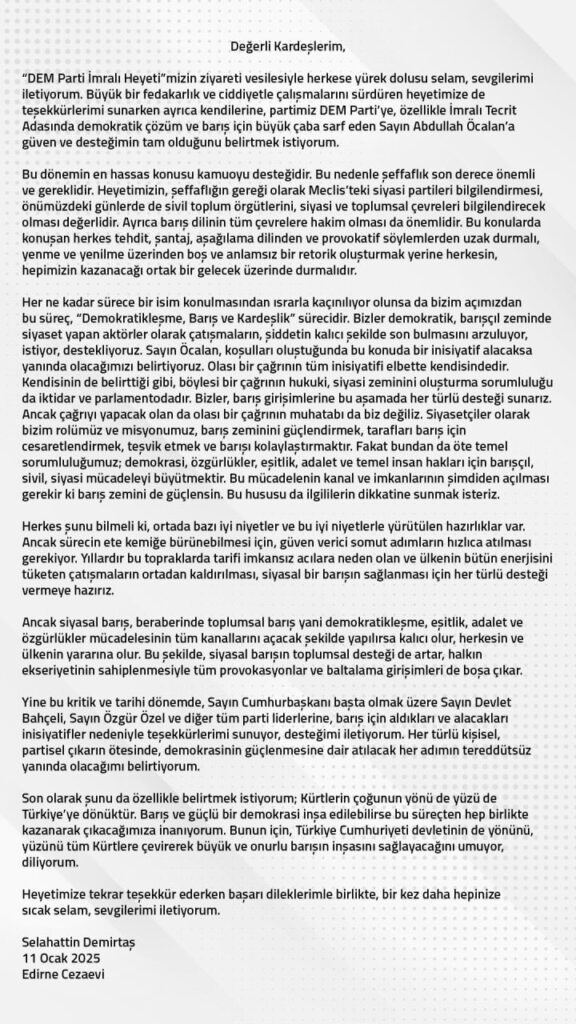 Edirne Cezaevi’nde tutuklu bulunan eski HDP Eş Genel Başkanı Selahattin Demirtaş, yazılı bir açıklama yaparak barış, demokrasi ve toplumsal uzlaşı çağrısında bulundu. Demirtaş, DEM Parti İmralı Heyeti’nin çalışmalarına teşekkür ederek sürecin şeffaflık ve kamuoyu desteğiyle ilerlemesi gerektiğine dikkat çekti.