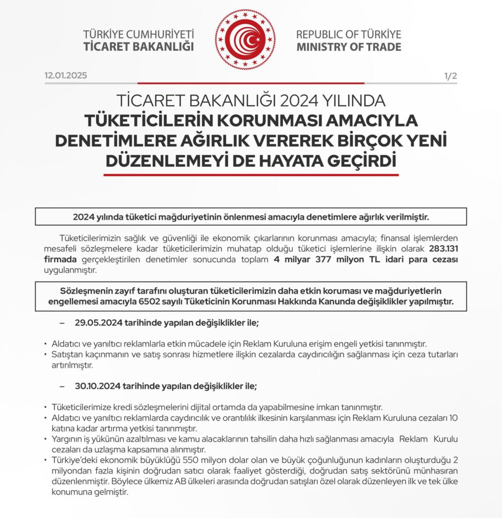 Ticaret Bakanlığı, 2024 yılında tüketicilerin haklarını korumak için kapsamlı düzenlemeler yaptı. Yanıltıcı reklamlara karşı cezalar artırıldı, restoran ve kafelere fiyat etiketlerini görünür şekilde asma zorunluluğu getirildi. Yenilenmiş ürünlerin satışı denetim altına alınırken, tüketicilerin cayma hakkı genişletildi. Denetimler kapsamında 283.131 firmaya 4 milyar 377 milyon TL ceza kesildi. Bu düzenlemeler, tüketici mağduriyetlerini önleme ve hakları koruma adına büyük bir adım olarak değerlendiriliyor.