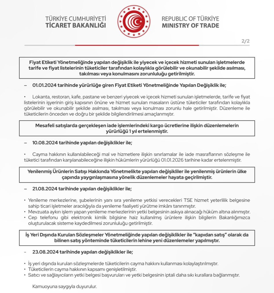 1 Ocak 2024’te yapılan değişiklikle, restoran, kafe ve pastanelere fiyat listelerini görünür şekilde asma zorunluluğu getirildi. Böylece tüketicilerin hizmet almadan önce bilgilendirilmesi amaçlandı.