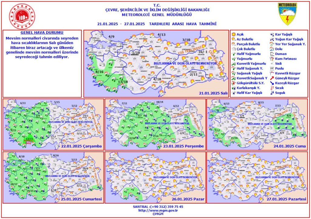21-27 Ocak 2025 tarihleri arasında Türkiye genelinde hava sıcaklıkları mevsim normalleri civarında başlayıp Salı gününden itibaren artış gösterecek. Çarşamba, Perşembe ve Cuma günleri buzlanma ve don olayları bekleniyor. Batı bölgelerde genellikle açık ve az bulutlu hava hâkimken, doğu bölgelerde kar yağışı ve buzlanma etkili olacak. Ege ve Akdeniz’de sağanak yağış, iç bölgelerde ise hafif kar yağışı görülebilir. Hafta sonunda ülke genelinde sakin bir hava öngörülüyor.