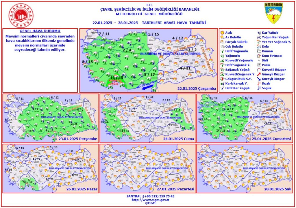 Meteoroloji Genel Müdürlüğü’ne göre, 22-28 Ocak 2025 Tarihlerinde Türkiye genelinde sıcaklıklar mevsim normallerinin üzerinde seyredecek. Ancak bazı bölgelerde fırtına, don ve kar yağışı etkili olacak. 22 Ocak Çarşamba: Marmara ve Karadeniz’de hafif kar, Akdeniz’de kuvvetli rüzgar, İç ve Doğu Anadolu’da don bekleniyor. 23 Ocak Perşembe: Batı Karadeniz ve İç Anadolu’da hafif kar yağışı, Doğu Anadolu’da yoğun kar yağışı görülecek. 24 Ocak Cuma: Karadeniz’de hafif kar ve yağmur, diğer bölgelerde buzlanma ve açık hava hakim. 26-28 Ocak: Batı bölgelerde güneşli, iç ve doğu bölgelerde buzlanma etkisini sürdürecek. Kritik Uyarılar: Akdeniz’de kuvvetli rüzgar, iç ve doğu bölgelerde buzlanma ile kar yağışı, tarım ve ulaşım faaliyetlerini olumsuz etkileyebilir. Vatandaşların günlük tahminleri takip etmeleri öneriliyor.