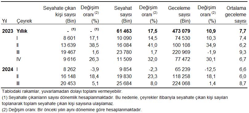 2024 yılı III. çeyreğinde, Türkiye içindeki seyahate çıkan kişi sayısı %8 artarak 20 milyon 453 bine ulaşırken, toplam seyahat sayısı ise 25 milyon 684 bin olarak kaydedildi. Seyahate çıkanlar 224 milyon geceleme yaptı ve ortalama geceleme süresi 8,7 gece oldu. Seyahat harcamaları %79,7 artışla 204 milyar TL’ye yükseldi, bu harcamaların büyük kısmı kişisel harcamalardan oluştu. Seyahatlerin en yaygın amacı ise %47,9 ile yakınları ziyaret etmek oldu. Konaklama tercihlerinde ise en çok arkadaş ya da akraba evlerinde kalındı.