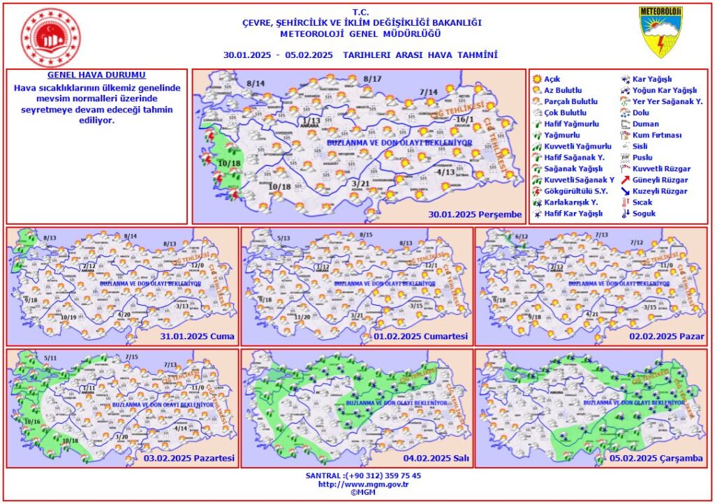 Meteoroloji Genel Müdürlüğü, 30 Ocak – 5 Şubat 2025 tarihleri arasındaki hava durumu raporunu açıkladı. Ülke genelinde hava sıcaklıklarının mevsim normallerinin üzerinde seyretmesi beklenirken, özellikle iç ve doğu bölgelerde buzlanma ve don olayları riski bulunuyor. Karadeniz kıyılarında yağış ihtimali, doğu bölgelerde yoğun kar yağışı ve don tehlikesi devam edecek. Marmara ve Ege bölgelerinde ise yağışsız hava bekleniyor. Vatandaşlar, bu olumsuz hava koşullarına karşı dikkatli olmaları, sürücülerin ve tarım sektöründekilerin gerekli tedbirleri alması gerektiği konusunda uyarıldı.