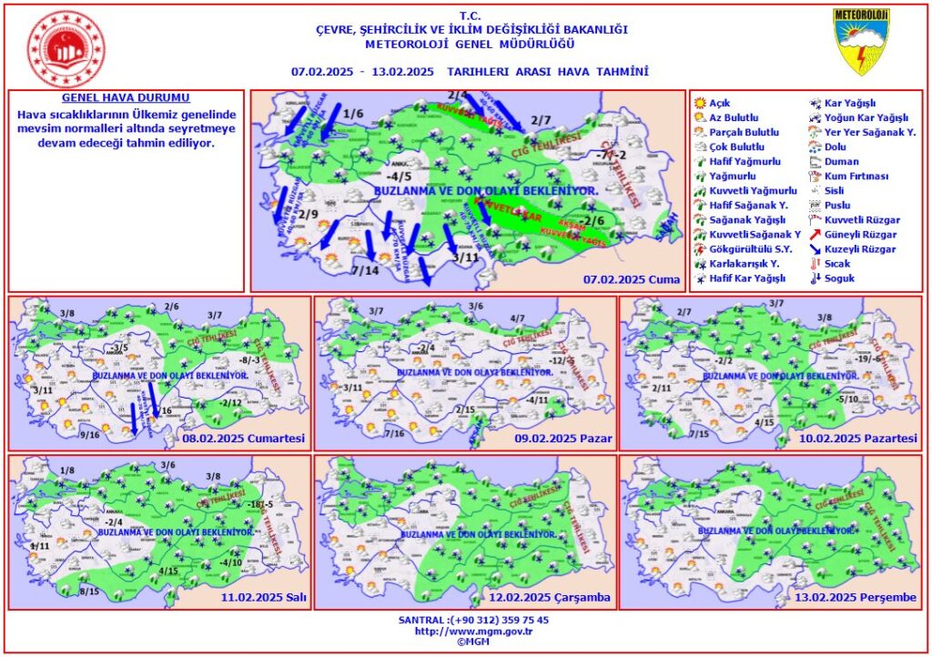 Meteoroloji Genel Müdürlüğü (MGM), 7-13 Şubat 2025 tarihleri arasını kapsayan hava tahmin raporunda, ülke genelinde hava sıcaklıklarının mevsim normallerinin altında seyredeceğini açıkladı. Özellikle Marmara, Karadeniz, İç Anadolu ve Doğu Anadolu bölgelerinde buzlanma ve don olayları beklenirken, yüksek kesimlerde çığ tehlikesine karşı uyarılar yapıldı. Yetkililer, vatandaşların ulaşımda dikkatli olması, tarımsal faaliyetlerde don riskine karşı önlem alınması ve meteorolojik gelişmelerin yakından takip edilmesi gerektiğini vurguladı.