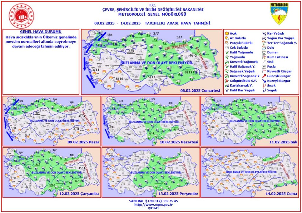 Meteoroloji Genel Müdürlüğü’nün 8-14 Şubat 2025 tarihli hava tahmin raporuna göre, Türkiye genelinde hava sıcaklıklarının mevsim normallerinin altında seyretmesi bekleniyor. Özellikle Doğu Anadolu ve Karadeniz’in yüksek kesimlerinde buzlanma, don ve çığ tehlikesine karşı vatandaşlar uyarılırken, Ege Denizi’nde hafta sonu etkili olacak kuvvetli fırtınanın denizcilere risk oluşturacağı belirtildi. Yetkililer, tarımsal faaliyetler ve ulaşım açısından önemli risk taşıyan meteorolojik olaylara karşı dikkatli ve tedbirli olunması gerektiğini vurguladı.