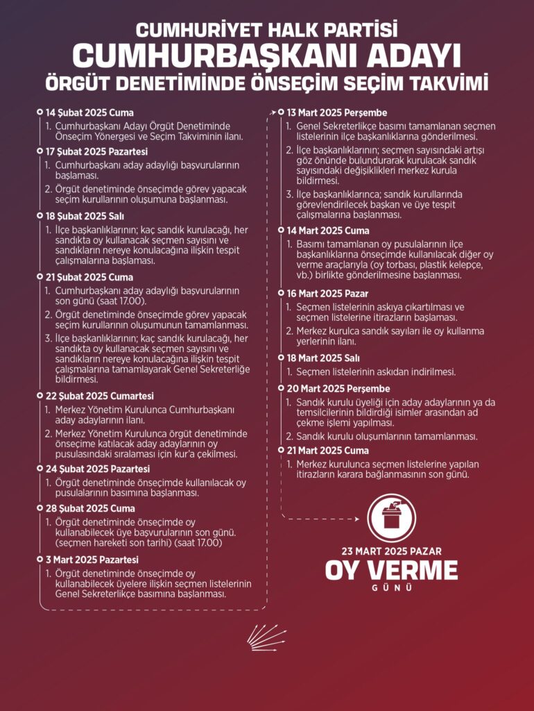 Önseçim sürecinde seçmen listeleri 3 Mart’ta basılacak, sandık kurulları oluşturulacak ve oy pusulalarının basımı tamamlanacak. Seçmen listelerine itiraz süreci 16 Mart’ta tamamlanacak ve kesinleşen listelerle 23 Mart 2025 Pazar günü parti üyeleri sandık başına giderek oy kullanacak.