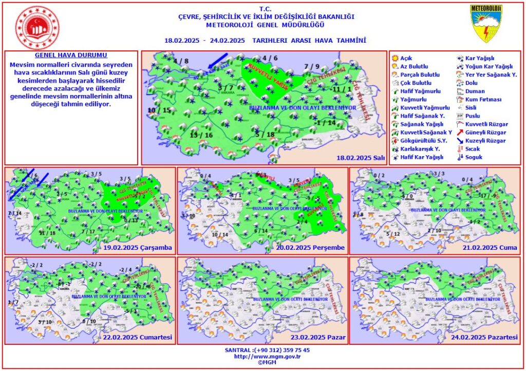 Meteoroloji Genel Müdürlüğü, 18-24 Şubat 2025 tarihleri arasındaki haftalık hava tahmini raporunu yayımladı. Yapılan değerlendirmelere göre, Salı gününden itibaren kuzey bölgelerden başlayarak hava sıcaklıkları hissedilir derecede düşecek ve ülke genelinde mevsim normallerinin altına inecek.