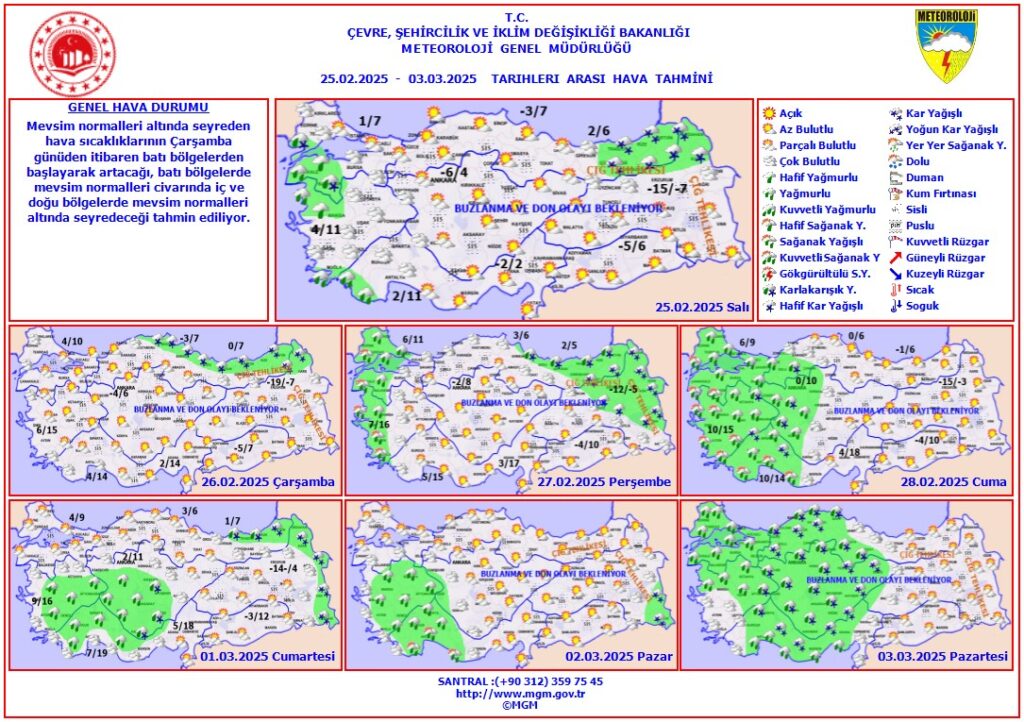 Meteoroloji Genel Müdürlüğü’nün haftalık hava tahmini raporuna göre, Türkiye genelinde mevsim normallerinin altında seyreden hava sıcaklıklarının Çarşamba gününden itibaren batı bölgelerden başlayarak artacağı tahmin ediliyor. Ancak iç ve doğu bölgelerde soğuk hava etkisini sürdürecek ve buzlanma ile don olayları görülecek.