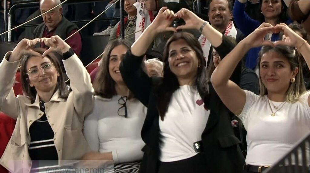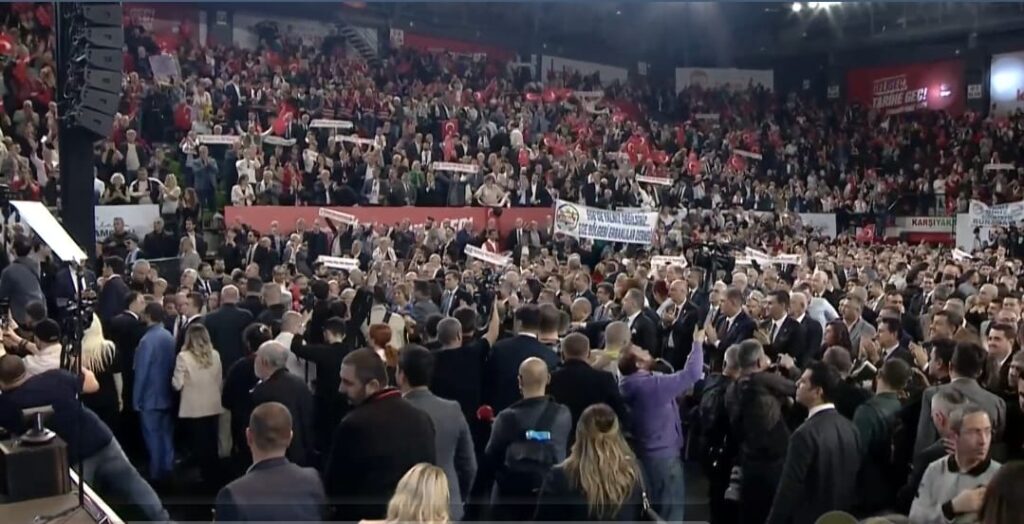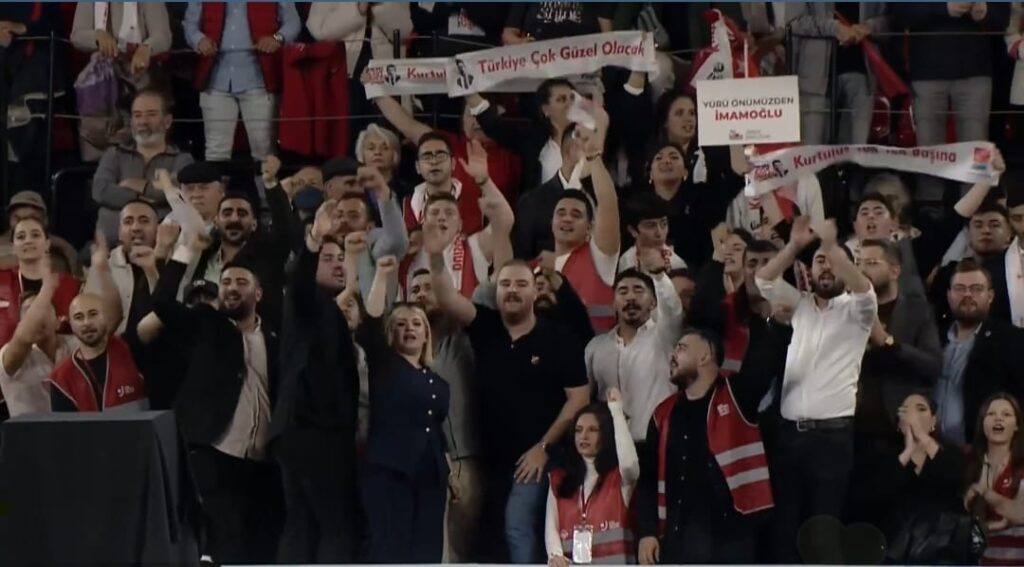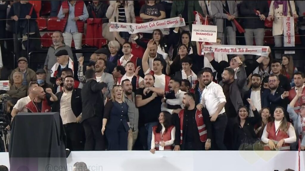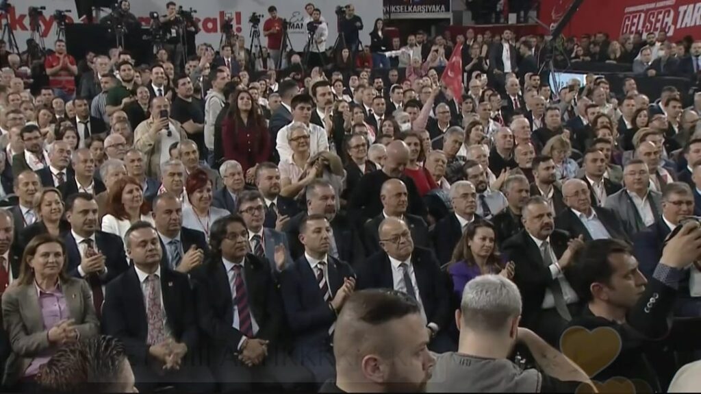 Miting alanında CHP değil, Türk bayrakları dalgalandı. Bu, halkın ve partililerin ulusal birliği vurgulayan bir simgesi olarak öne çıktı. Ayrıca, salonda yer alan pankartlar dikkat çekti: “Yolumuz uzun, heyecanımız yüksek, gençliğimiz var. Sen Cumhurbaşkanı yapacağız” gibi ifadelerle, gençlerin ve halkın desteği ile bu yolculuğun başarılacağı mesajı verildi.