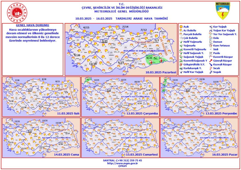 10-16 Mart 2025 Haftalık Hava Durumu Tahmini: Sıcak Hava Dalgası Devam Edecek! Meteoroloji Genel Müdürlüğü, 10-16 Mart 2025 tarihleri arasındaki hava durumu tahminini açıkladı. Bu hafta boyunca Türkiye genelinde hava sıcaklıklarının mevsim normallerinin 8-12 derece üzerinde olması bekleniyor. Açık ve güneşli hava etkili olacakken, iç ve doğu bölgelerde sabah saatlerinde buzlanma ve don olayları görülebilir. Batı bölgelerde ise sıcaklıkların 25°C’yi aşması bekleniyor. Haftanın genelinde bahar havası etkisini gösterecek, ancak yerel yağışlar ve rüzgarlar bazı bölgelerde etkili olabilir.