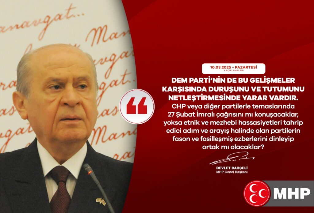Bahçeli, DEM Parti’ye de çağrıda bulunarak, bu partiye Türkiye’nin birliğinden yana mı yoksa ayrılıkçı söylemlerden yana mı tavır alacakları konusunda net bir tutum sergilemeleri gerektiğini ifade etti.