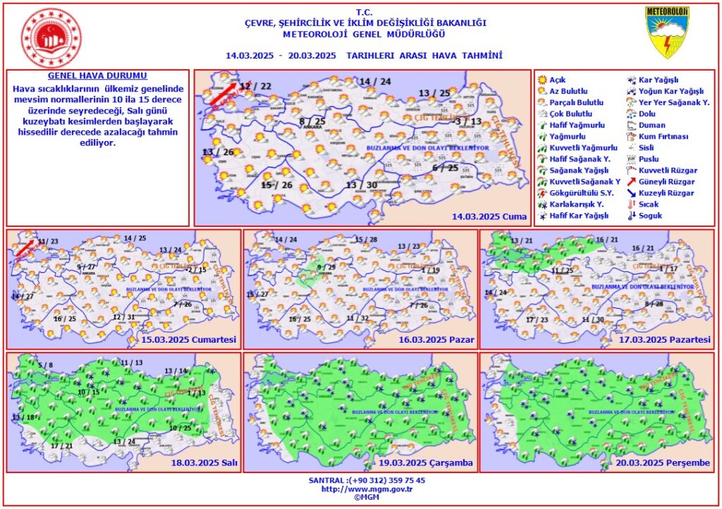 📅 Meteoroloji Genel Müdürlüğü (MGM), 14-20 Mart 2025 tarihleri arasındaki hava tahmin raporunu yayımladı. Haftanın ilk günlerinde sıcaklıklar mevsim normallerinin 10-15 derece üzerinde seyredecek. Ancak 18 Mart Salı günü itibarıyla kuzeybatıdan başlayarak ülke genelinde sıcaklıklar hissedilir derecede düşecek ve yağış etkili olacak.
