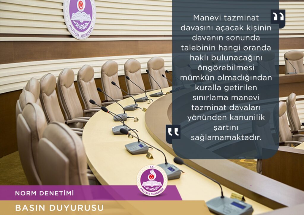 Mahkeme, manevi tazminat davalarında hâkimin takdir yetkisinin geniş olduğunu ve davacıların talep ettikleri tazminatın hangi oranda kabul göreceğini öngöremeyeceğini belirtti. Bu durumun mahkemeye erişim hakkını kısıtladığı vurgulanarak, ilgili düzenlemenin Anayasa’nın 13. maddesinde yer alan kanunilik şartına aykırı olduğu ifade edildi.