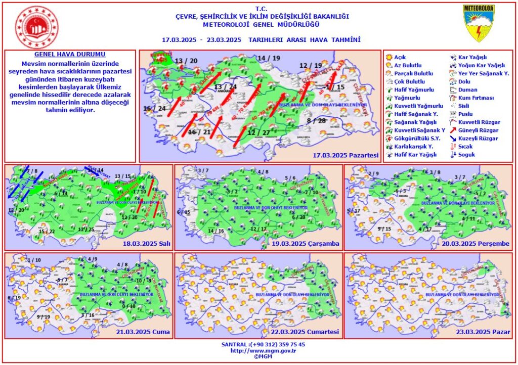 Meteoroloji Genel Müdürlüğü, 17-23 Mart 2025 tarihleri arasında Türkiye genelinde sert hava değişimleri yaşanacağını duyurdu. Mevsim normallerinin 10-18 derece üzerinde seyreden sıcaklıkların hızla düşeceği ve kuvvetli yağışların etkili olacağı tahmin ediliyor.