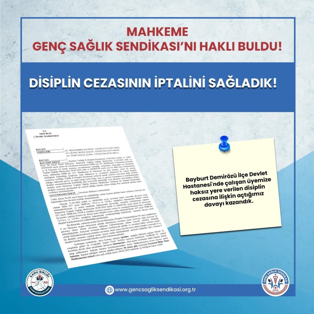 Genç Sağlık Sendikası Bayburt İl Başkanı Muharrem Turhan, sosyal medya hesabı üzerinden önemli bir açıklama yaparak, sağlık personelinin hak mücadelesindeki zaferini duyurdu. Bayburt’tan Erzurum İdari Mahkemesi’ne kadar uzanan hukuki bir süreç sonunda, bir sağlık çalışanının hakkını kazandığı bildirildi. İşte detaylar: