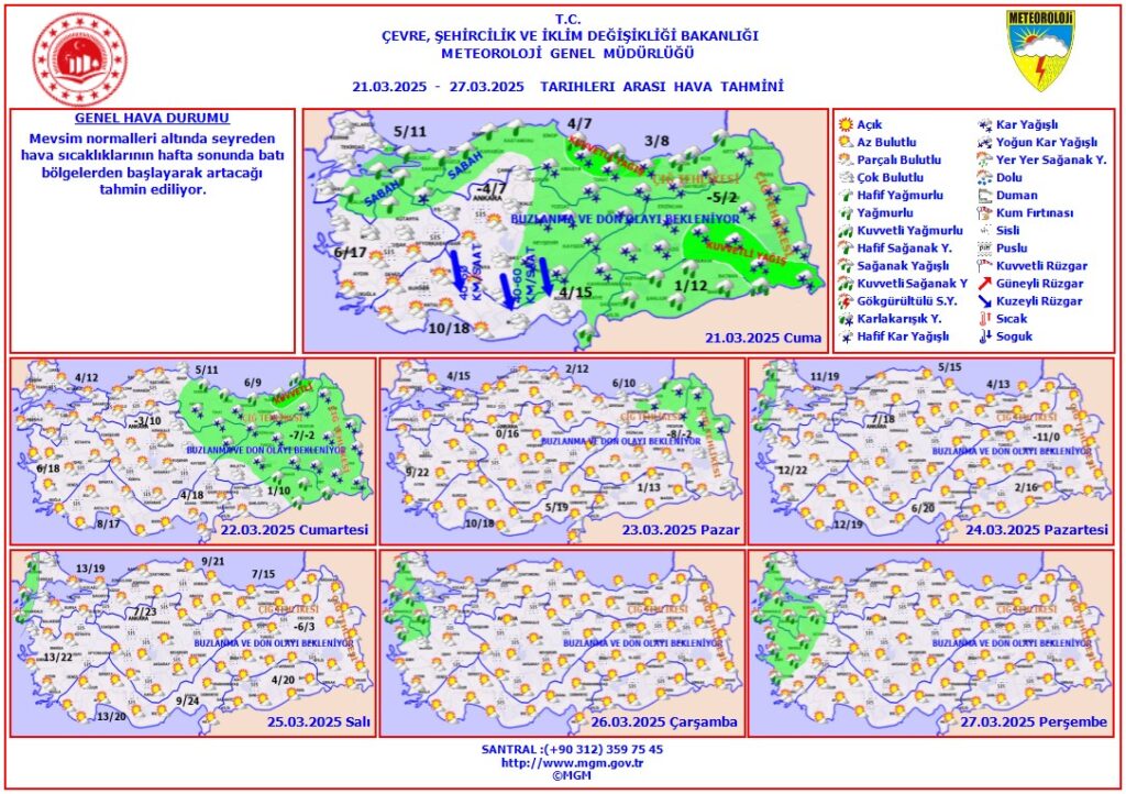 🌡️ Meteoroloji Genel Müdürlüğü, 21-27 Mart 2025 haftalık hava tahminini açıkladı! Mevsim normallerinin altında seyreden sıcaklıkların, hafta sonundan itibaren batı bölgelerden başlayarak yükselmesi bekleniyor. 📈 Cuma günü kar yağışı ve don olaylarına dikkat! 🚨 Hafta sonu ise parçalı bulutlu ve güneşli hava hakim olacak. 🌤️ Salı gününden itibaren sıcaklıklar mevsim normallerinin üzerine çıkacak. 🔥 Seyahat ve açık hava planları yapacaklar için güncel hava durumu tahminlerini MGM resmi sitesi üzerinden takip etmek önemli! 🌍