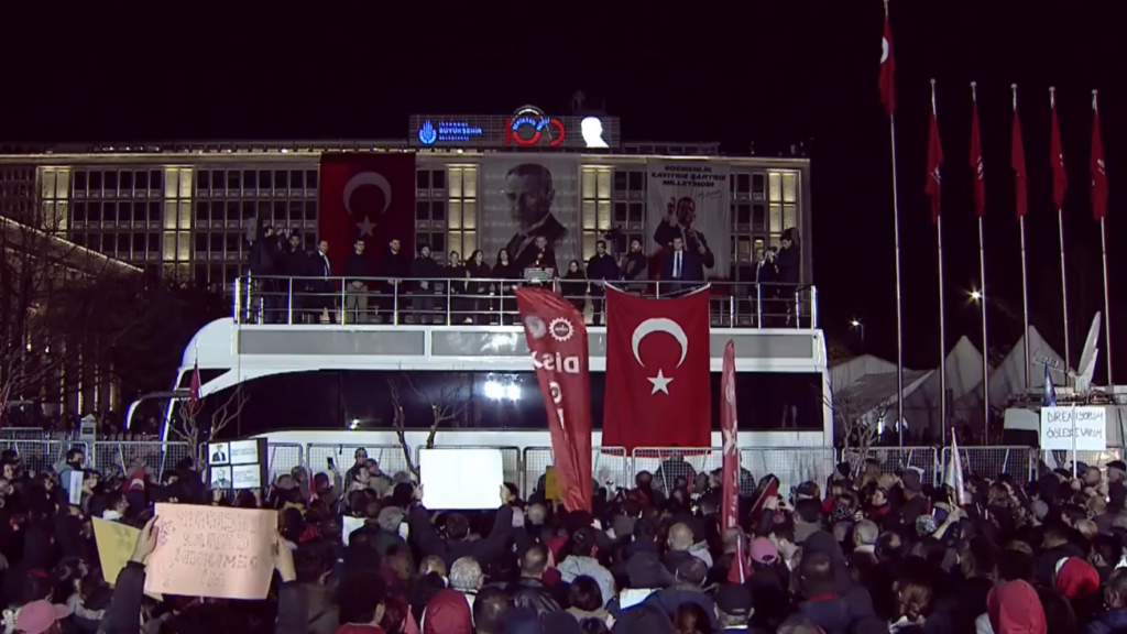 CHP’nin çağrısının ardından akşam saat 20.30’da Saraçhane Meydanı’na toplanan vatandaşlar, “Teslim olmuyoruz!” sloganlarıyla hükümete karşı güçlü bir duruş sergiledi. Konuşmasında, Özgür Özel, halkın demokrasiye sahip çıkma kararlılığını yineledi ve İstanbul’un geleceğini kaybetmenin Türkiye’nin geleceğini kaybetmek anlamına geldiğini belirtti.