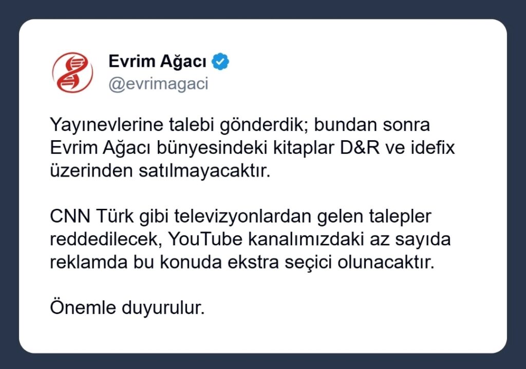CHP Genel Başkanı Özgür Özel’in yaptığı boykot çağrısı sonrası, Evrim Ağacı’nın kitapları büyük satış platformlarından D&R ve idefix’te artık yer almayacak. Özel’in çağrısı üzerine bir adım atan Evrim Ağacı, sadece bu iki platformda değil, aynı zamanda CNN Türk gibi büyük televizyon kanallarından gelen talepleri de reddedeceklerini duyurdu. Ayrıca, Evrim Ağacı, YouTube kanallarındaki reklamlara daha seçici yaklaşılacağını ve içeriklerinin belirli kriterlere göre yayınlanacağını açıkladı.