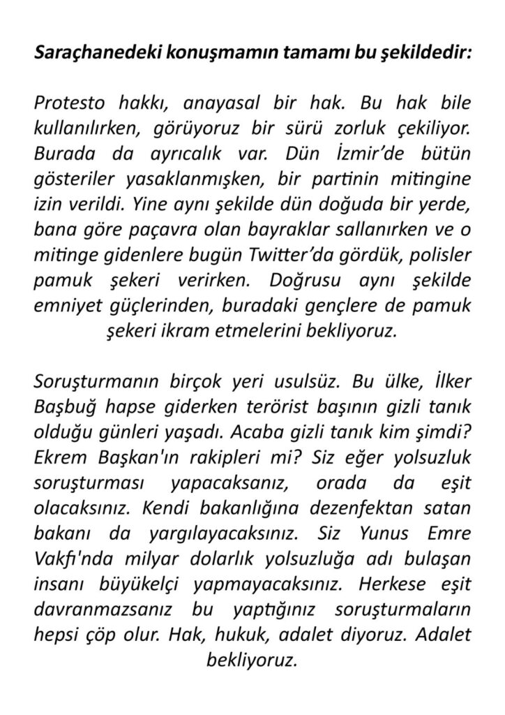 Mansur Yavaş, polisin bazı mitinglerde gösterdiği müsamahanın, İstanbul Saraçhane ve Ankara Kızılay’da sergilenmemesine tepki göstererek, gençlere yönelik biber gazı ve tazyikli su kullanımını eleştirdi. “Bu eleştirimiz, anayasal haklara yönelik farklı muameleyedir. Biz, herkese eşit uygulama istiyoruz.” dedi.