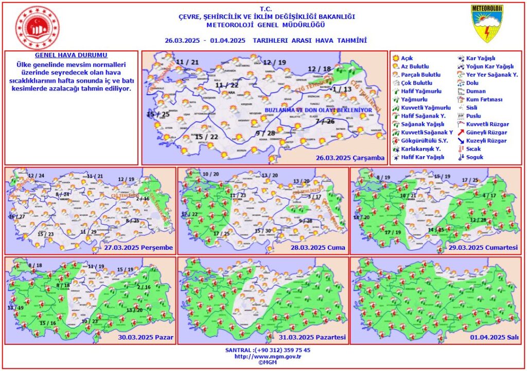 Meteoroloji Genel Müdürlüğü, 25 Mart – 1 Nisan 2025 tarihleri arasında ülke genelinde mevsim normallerinin üzerinde seyredecek hava sıcaklıklarının hafta sonu iç ve batı bölgelerde azalacağını duyurdu. Ayrıca, buzlanma ve don olayı da bekleniyor.