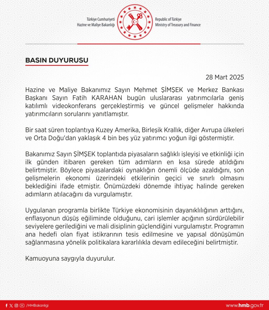Hazine ve Maliye Bakanı Mehmet Şimşek ile Merkez Bankası Başkanı Fatih Karahan, uluslararası yatırımcılarla geniş katılımlı bir videokonferans gerçekleştirdi. 4.500 yatırımcının takip ettiği toplantıda, Türkiye ekonomisine dair son gelişmeler ve hükümetin yol haritası ele alındı.