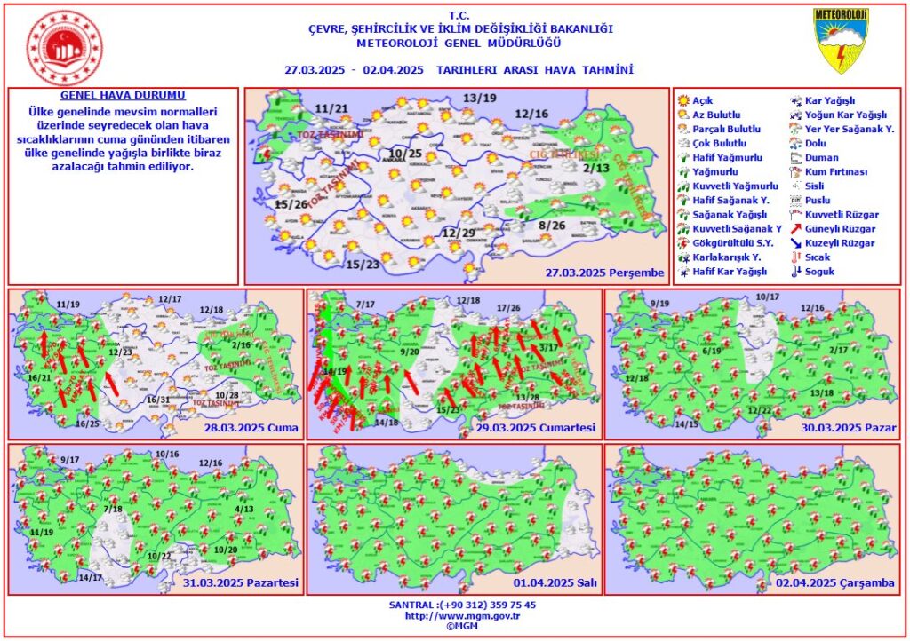 Meteoroloji Genel Müdürlüğü (MGM), 27 Mart – 2 Nisan 2025 tarihleri arasındaki hava tahmin raporunu yayımladı. Ülke genelinde mevsim normallerinin üzerinde seyreden sıcaklıkların, Cuma gününden itibaren yağışlarla birlikte azalması bekleniyor. İşte gün gün hava durumu detayları:
