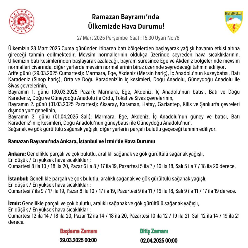 Meteoroloji Genel Müdürlüğü, 27 Mart 2025 tarihinde yayımladığı uyarıda, Ramazan Bayramı süresince ülke genelinde hava durumu tahminlerini paylaştı. 28 Mart 2025 Cuma gününden itibaren batı bölgelerden başlayarak yağışlı havanın etkili olacağı belirtilirken, sıcaklıkların batıdan başlayarak düşeceği bildirildi.