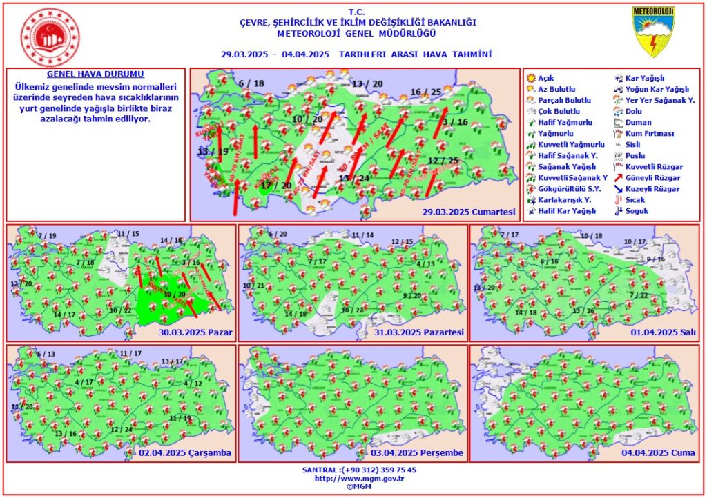 Meteoroloji Genel Müdürlüğü’nün yayınladığı haftalık hava tahmin raporuna göre, hava sıcaklıkları mevsim normallerinin üzerinde seyrederken yağışlarla birlikte biraz azalacak. İşte gün gün hava durumu detayları: