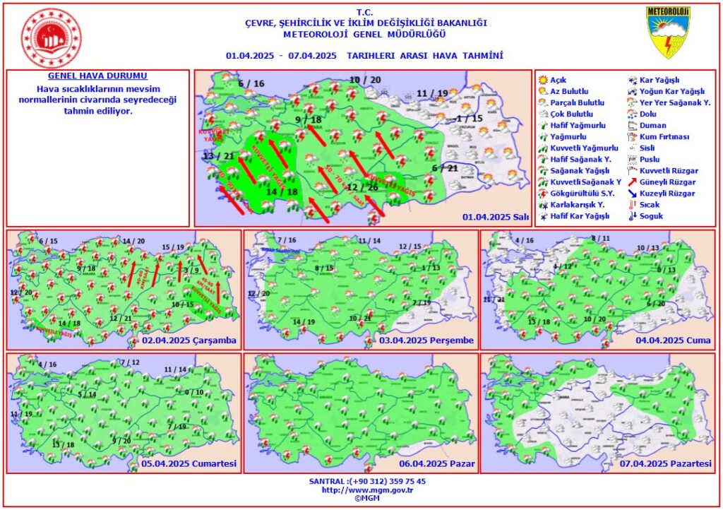 📌 Genel Değerlendirme: Türkiye genelinde yağışlı ve serin bir hafta bekleniyor. Özellikle Doğu Anadolu’da karla karışık yağmur ve İç Anadolu ile Karadeniz’de sağanak yağışlar etkili olabilir. Batı bölgelerde hafta sonuna doğru hava açarken, doğu kesimlerde yağış sürecek.
