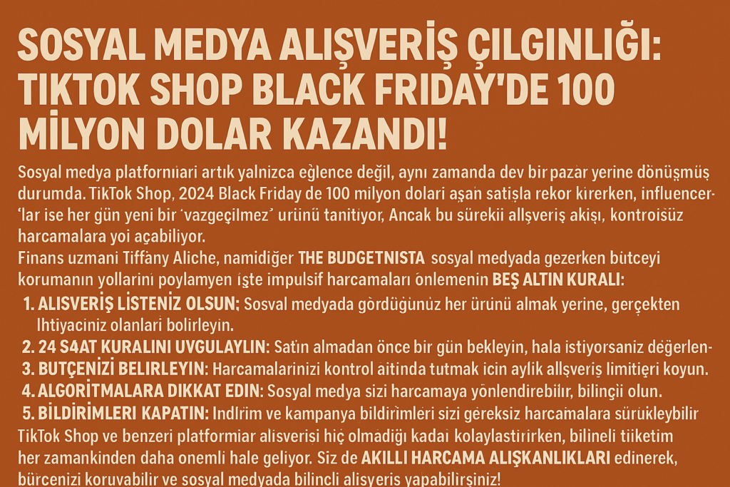 Sosyal medya platformları artık yalnızca eğlence değil, aynı zamanda dev bir pazar yerine dönüşmüş durumda. TikTok Shop, 2024 Black Friday’de 100 milyon doları aşan satışla rekor kırarken, influencer’lar ise her gün yeni bir “vazgeçilmez” ürünü tanıtıyor. Ancak bu sürekli alışveriş akışı, kontrolsüz harcamalara yol açabiliyor.