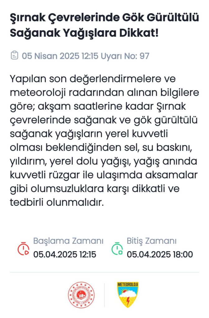 @AFADBaskanlik ve @SirnakValiligi sosyal medya hesaplarından da paylaşılan uyarıda, özellikle akşam saatlerine kadar yaşanabilecek olumsuzluklara karşı tedbirli olunması çağrısında bulunuldu.