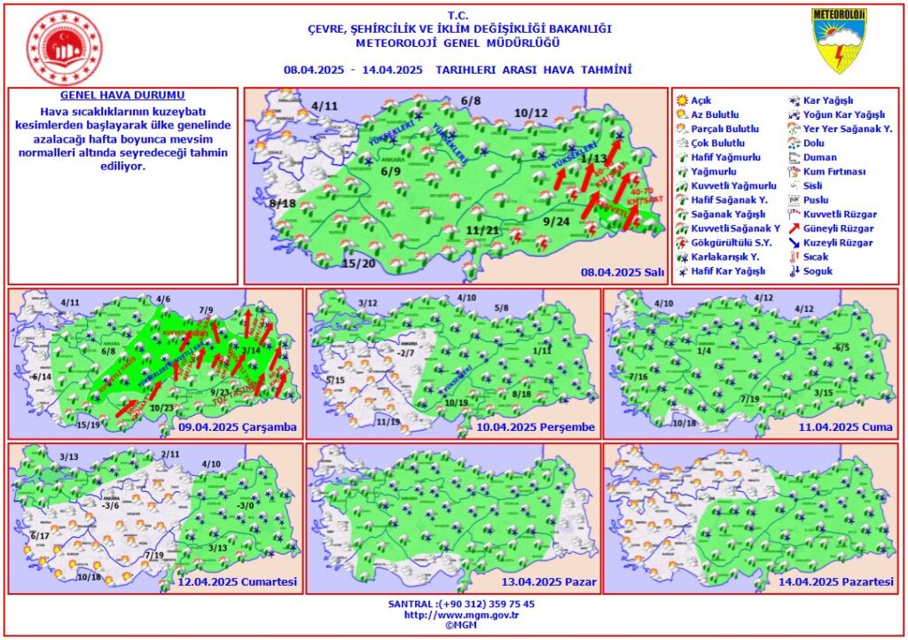 Meteoroloji Genel Müdürlüğü (MGM) tarafından yayımlanan haftalık hava tahmin raporuna göre, 8 Nisan 2025 Salı günü başlayarak, 14 Nisan 2025 Pazartesi’ye kadar Türkiye genelinde soğuk ve kar yağışlı hava koşulları hakim olacak. Hava sıcaklıkları, kuzeybatı kesimlerden başlayarak tüm ülke genelinde mevsim normallerinin altında seyredecek.