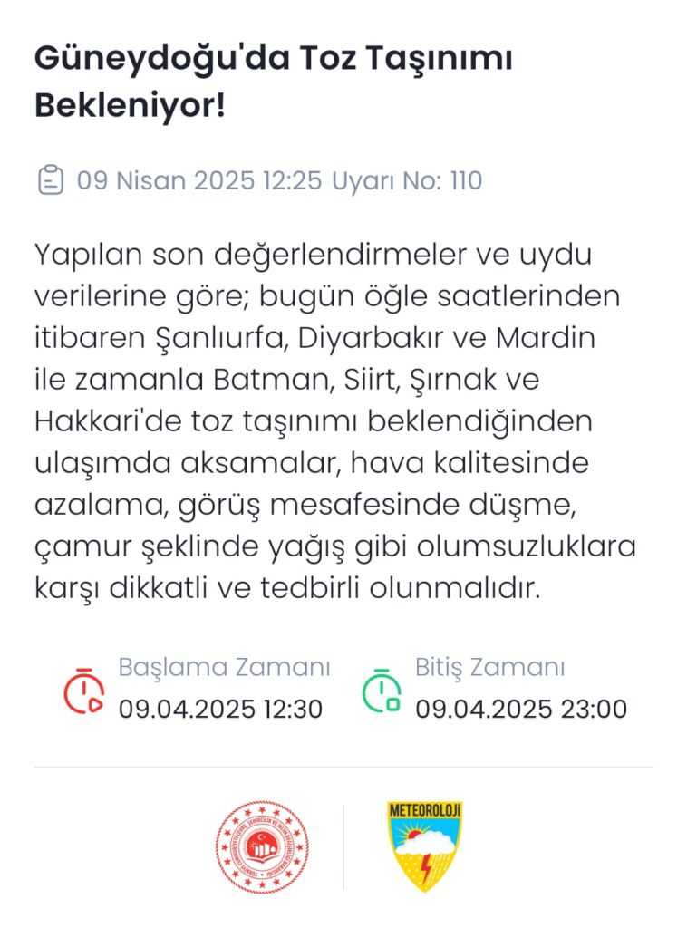Meteoroloji Genel Müdürlüğü, 9 Nisan 2025 tarihinde yaptığı açıklamada, Güneydoğu Anadolu Bölgesi’nde toz taşınımı beklendiğini duyurdu. Şanlıurfa, Diyarbakır, Mardin illerinin yanı sıra, Batman, Siirt, Şırnak ve Hakkari illerinde öğle saatlerinden itibaren etkili olacak toz taşınımının, ulaşımda aksamalara, hava kalitesinde azalmaya ve görüş mesafesinde düşüşe yol açabileceği uyarısı yapıldı.