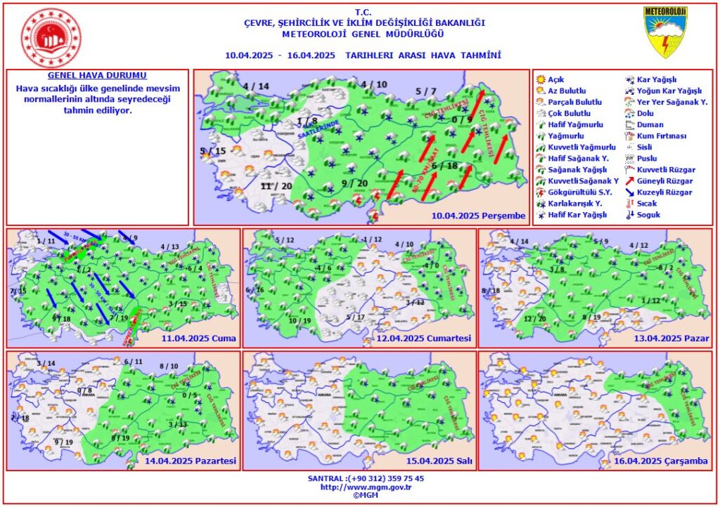 Meteoroloji Genel Müdürlüğü, 10-16 Nisan 2025 tarihlerini kapsayan haftalık hava durumu tahmin raporunu yayımladı. Rapora göre hava sıcaklıkları mevsim normallerinin altında seyredecek ve yağışlar yurt genelinde etkili olacak.