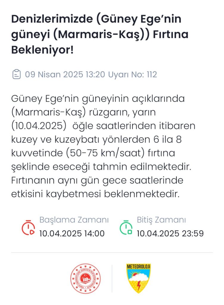 Meteoroloji Genel Müdürlüğü, Güney Ege’nin güneyi (Marmaris – Kaş) açıklarında fırtına beklendiğini duyurdu. 10 Nisan 2025 tarihinde öğle saatlerinden itibaren, rüzgarın kuzey ve kuzeybatı yönlerinden 6 ila 8 kuvvetinde (50-75 km/saat) fırtına şeklinde eseceği tahmin ediliyor. Fırtınanın, aynı gün gece saatlerinde etkisini kaybetmesi bekleniyor.