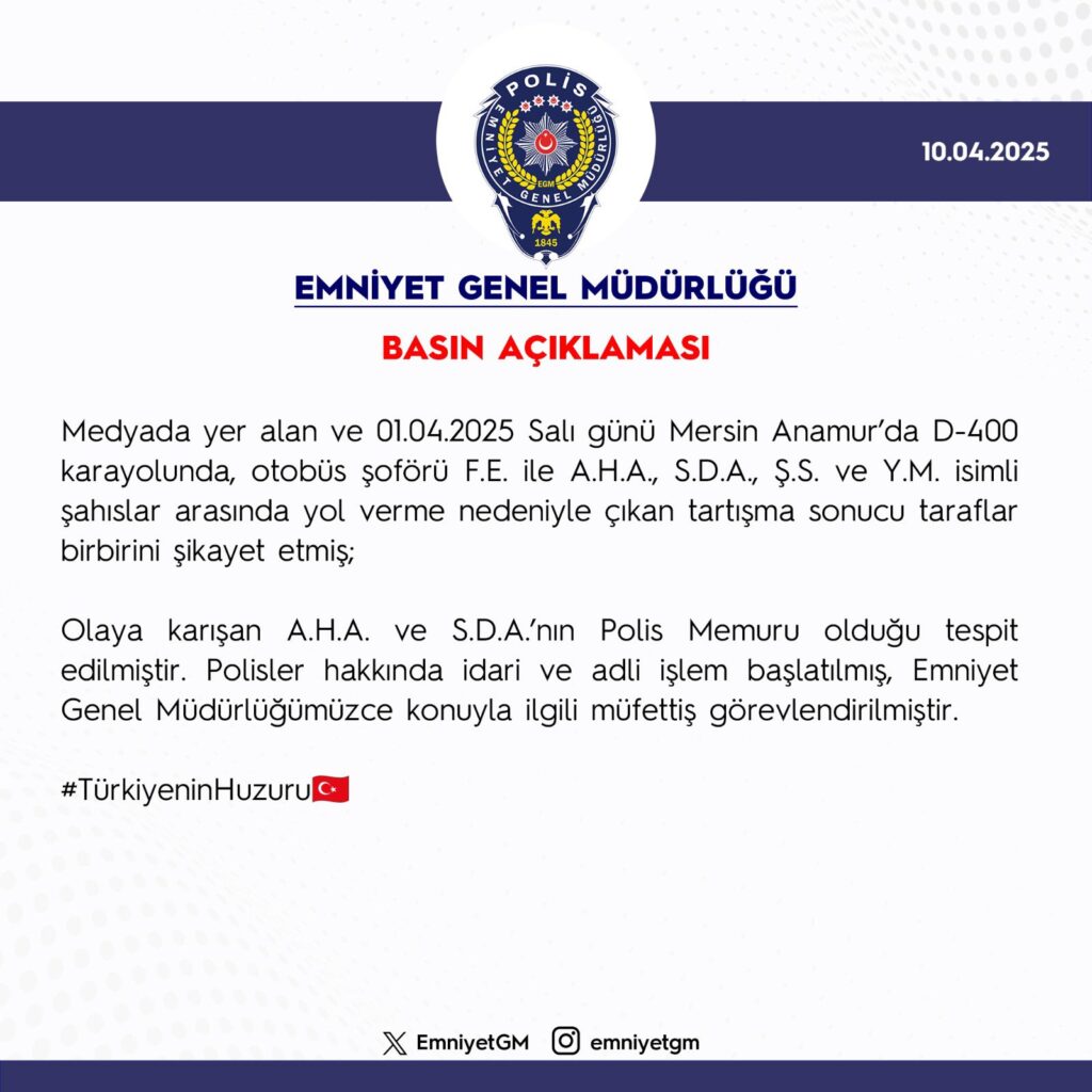 MERSİN (10 Nisan 2025) – Emniyet Genel Müdürlüğü, 1 Nisan 2025 Salı günü Mersin’in Anamur ilçesinde D-400 karayolunda yaşanan ve kamuoyuna yansıyan tartışmayla ilgili resmi bir açıklama yaptı. Yol verme meselesi nedeniyle yaşanan gerginliğe iki polis memurunun da karıştığı ortaya çıktı.