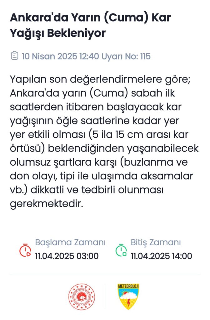 Ankara’da yarın, 11 Nisan Cuma günü sabah saatlerinden itibaren kar yağışı bekleniyor. Meteoroloji Genel Müdürlüğü‘nün yaptığı son değerlendirmelere göre, kar yağışının öğle saatlerine kadar etkili olması ve 5 ila 15 cm arasında kar örtüsü oluşturması bekleniyor. Bu durum, şehirde çeşitli olumsuz şartlara yol açabilir.
