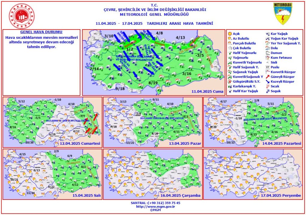 Türkiye genelinde 11-17 Nisan 2025 tarihleri arasında hava sıcaklıklarının mevsim normallerinin altında seyretmeye devam etmesi bekleniyor. Meteoroloji Genel Müdürlüğü, buzlanma, don olayları ve kuvvetli yağışlara karşı vatandaşları uyardı. İşte gün gün detaylı hava durumu analizi: