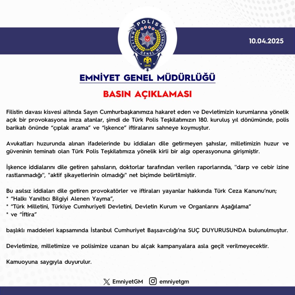 Emniyet Genel Müdürlüğü (EGM), bazı kişi ve grupların Türk Polis Teşkilatı’nın 180. kuruluş yıl dönümünde gündeme getirdiği “çıplak arama” ve “işkence” iddialarına ilişkin sert bir basın açıklaması yayımladı. Açıklamada, bu iddiaların asılsız ve provokatif olduğu vurgulandı.