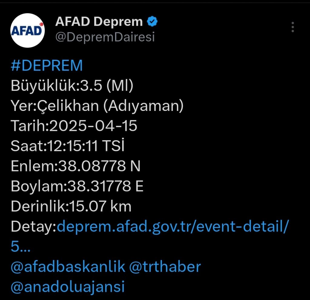 Afet ve Acil Durum Yönetimi Başkanlığı (AFAD) verilerine göre, 15 Nisan 2025 Salı günü saat 12:15’te, Adıyaman’ın Çelikhan ilçesinde 3.5 (Ml) büyüklüğünde bir deprem meydana geldi. Depremin yeryüzüne 15.07 kilometre derinlikte gerçekleştiği bildirildi.