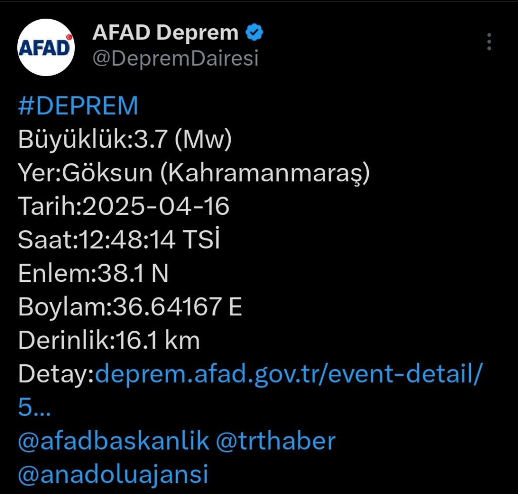 Kahramanmaraş’ın Göksun ilçesinde 3.7 büyüklüğünde deprem meydana geldi. Afet ve Acil Durum Yönetimi Başkanlığı (AFAD) tarafından açıklanan verilere göre, deprem 16 Nisan 2025 saat 12:48’de yerin 16.1 kilometre derinliğinde kaydedildi.