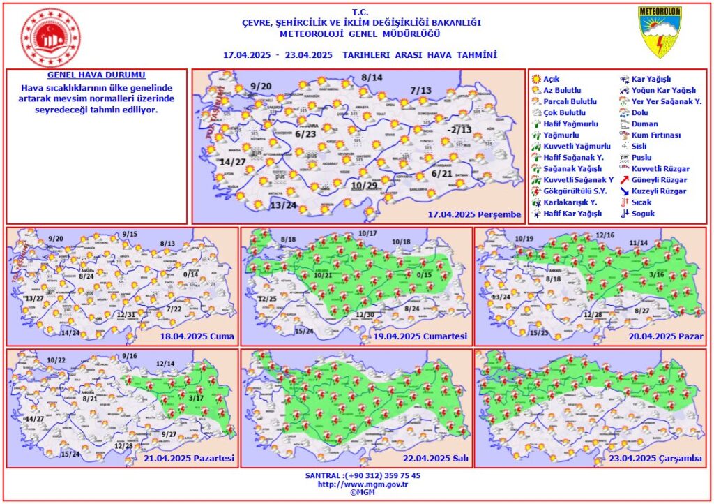 📅 17 – 23 Nisan 2025 tarihleri arasında Türkiye genelinde hava sıcaklıklarının mevsim normallerinin üzerine çıkması bekleniyor. Meteoroloji Genel Müdürlüğü tarafından yapılan haftalık tahmin raporuna göre, özellikle batı ve iç kesimlerde güneşli günler ön planda olacak. Ancak bazı bölgelerde yerel sağanak yağışlar görülebilir.