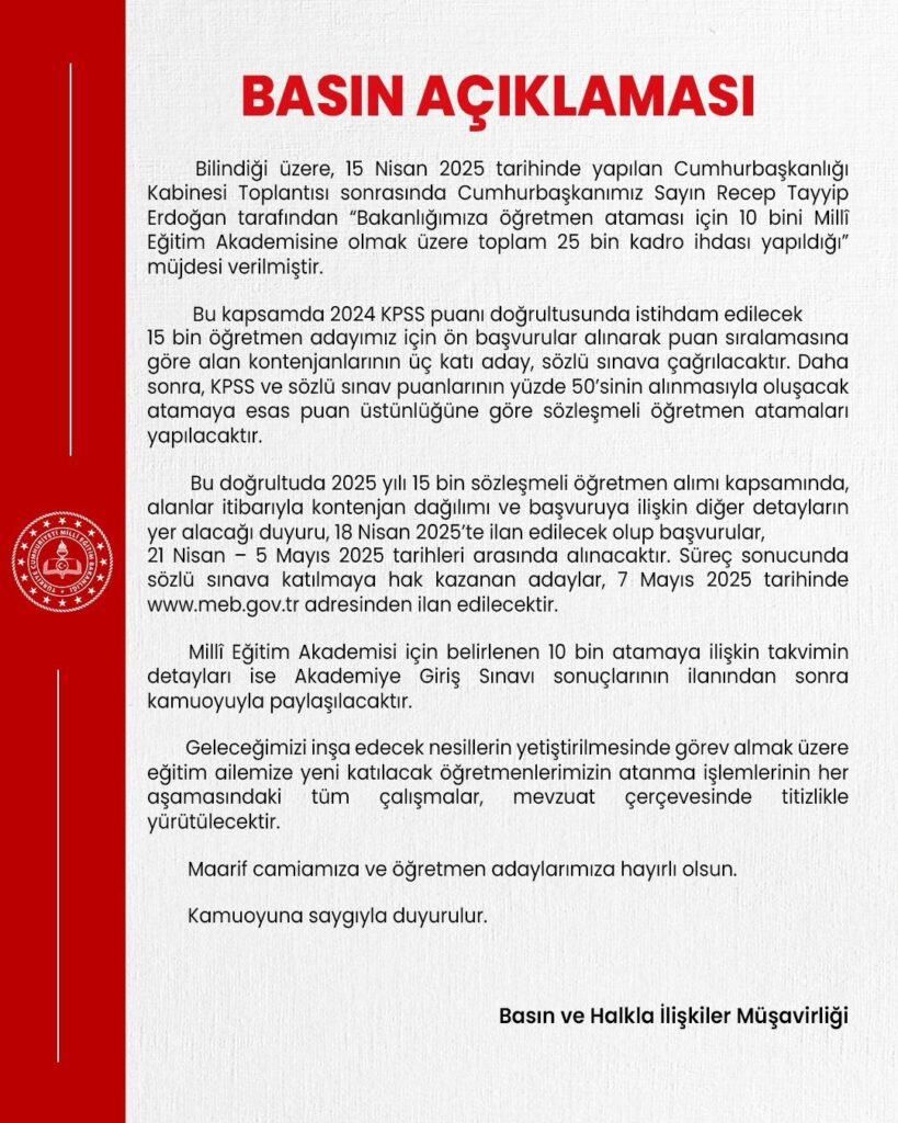 Milli Eğitim Bakanlığı, 15 Nisan 2025 tarihinde gerçekleştirilen Cumhurbaşkanlığı Kabine Toplantısı sonrasında Cumhurbaşkanı Recep Tayyip Erdoğan’ın açıkladığı öğretmen ataması müjdesine ilişkin detayları paylaştı. Yapılan açıklamaya göre, 10 bini Millî Eğitim Akademisi’ne alınmak üzere toplam 25 bin öğretmen istihdamı gerçekleştirilecek.