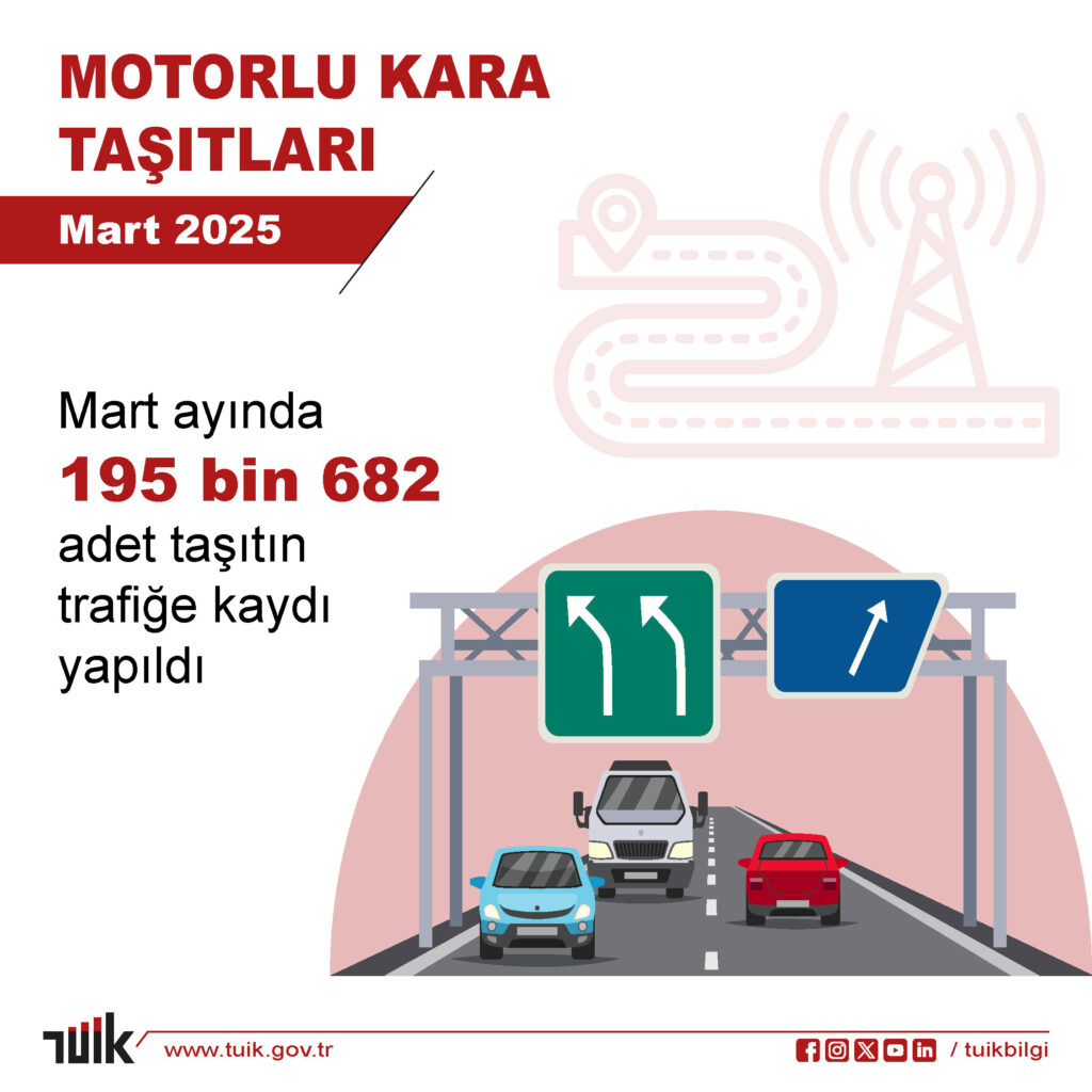 Türkiye İstatistik Kurumu (TÜİK), Mart 2025 Motorlu Kara Taşıtları İstatistiklerini açıkladı. Verilere göre Mart ayında 195 bin 682 adet taşıtın trafiğe kaydı yapıldı. Aylık bazda %43,0’lık artış dikkat çekerken, yıllık bazda ise %13,7’lik bir düşüş yaşandı.