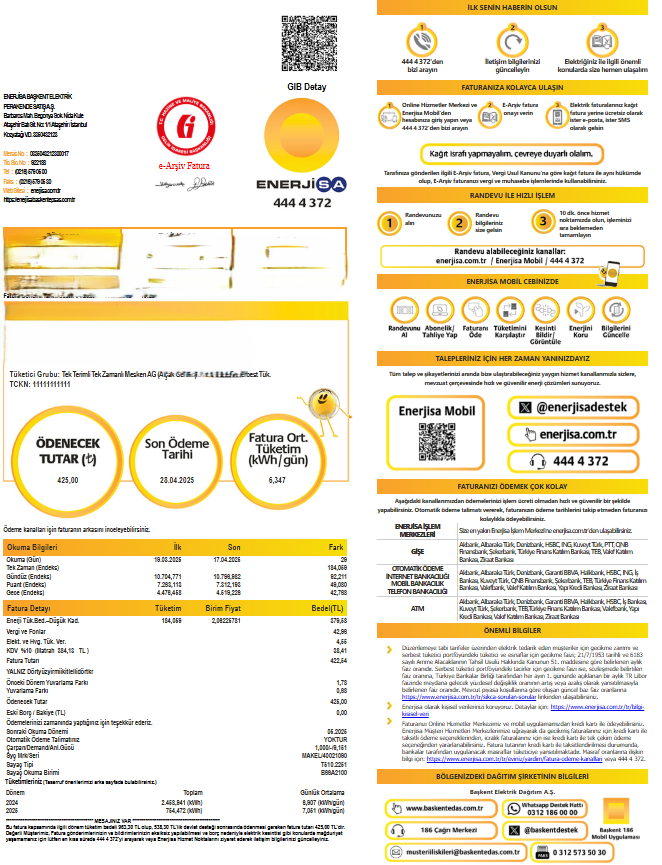 Enerji bedeli olarak 379,58 TL, vergiler ve fonlar dahil edildiğinde toplam tutar 422,54 TL’ye çıkıyor. Yuvarlama farkıyla birlikte vatandaşın fiilen ödeyeceği tutar 425,00 TL oluyor.