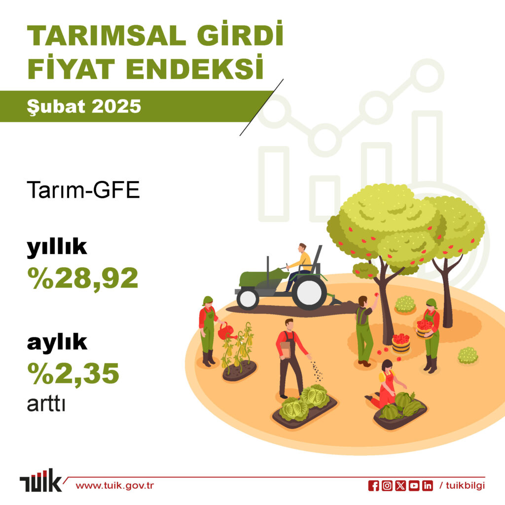 2025 yılı Şubat ayında, tarımda kullanılan mal ve hizmetler endeksinde %2,40 artış görülürken, tarımsal yatırıma katkı sağlayan mal ve hizmetler endeksi %2,02 oranında yükseldi. 2024 yılının Aralık ayına göre Tarım-GFE, %8,38 artış gösterdi. On iki aylık ortalamalar dikkate alındığında ise endeksin artışı %37,78 olarak kaydedildi.